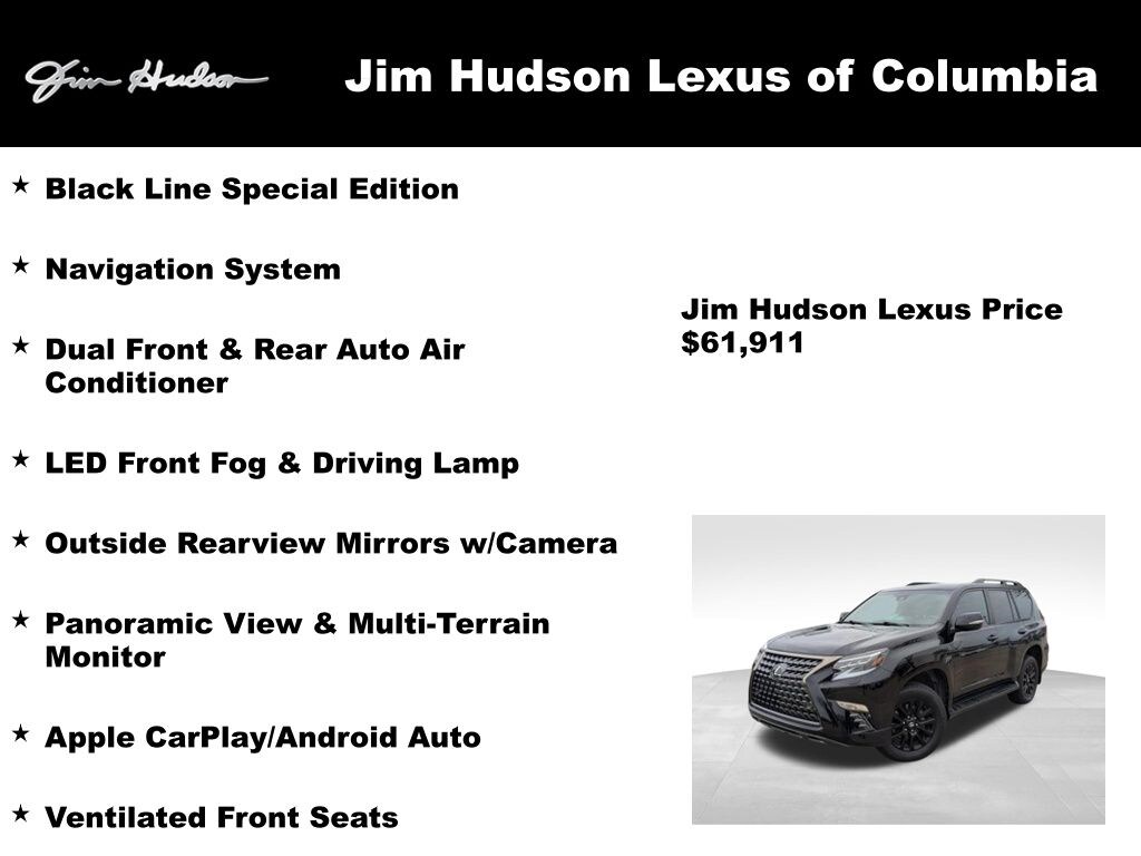 2023 Lexus GX 460 Apple CarPlay/Android Auto, Black Line Special Edition, Dual Front & Rear Auto Air Conditioner, Front & Rear Heated Seats, LED Front Fog & Driving Lamp, Navigation System, NuLuxe Seat Trim (EF), Outside Rearview Mirrors w/Camera, Panoramic View & Multi-Terrain Monitor, Ventilated Front Seats, Windshield De-Icer, Windshield Wiper Control w/Rain Sensor.