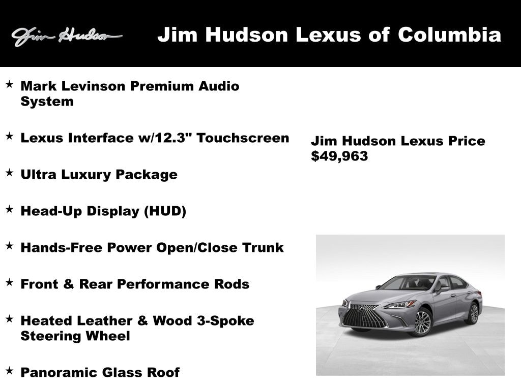 2024 Lexus ES 350 Ultra Luxury Mark Levinson Premium Audio System, Lexus Interface w/12.3" Touchscreen, Black w/Wood Black Trim w/Leather Seat Trim, Acoustic Side Glass, Front & Rear Performance Rods, Hands-Free Power Open/Close Trunk, Head-Up Display (HUD), Heated Leather & Wood 3-Spoke Steering Wheel, Intuitive Parking Assist & Panoramic View Monitor, Panoramic Glass Roof, Power Rear Sunshade, Power Tilt/Telescoping Steering Wheel w/Memory, Rain Sensing Wipers, Rear Spoiler, Triple Beam LED Headlamps, Ultra Luxury Package, Windshield De-Icer, Wireless Apple CarPlay/Wireless Android Auto, Wireless Charger, Wood Trim w/Ambient Lighting.