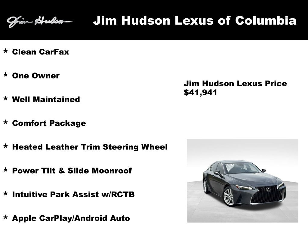 2024 Lexus IS 300 Clean CarFax, One Owner, Well Maintained, Black w/Perforated NuLuxe Seat Trim, Apple CarPlay/Android Auto, Comfort Package, Heated & Ventilated Front Seats, Heated Leather Trim Steering Wheel, Intuitive Park Assist w/RCTB, Power Tilt & Slide Moonroof, Rain-Sensing Intermittent Windshield Wipers.