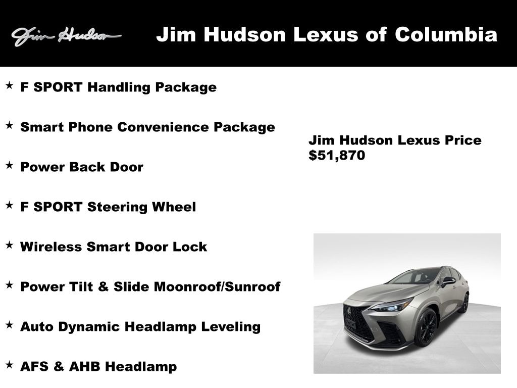 2024 Lexus NX 350 F SPORT Handling AFS & AHB Headlamp, Auto Dynamic Headlamp Leveling, F SPORT Handling Package, F SPORT Steering Wheel, Power Back Door, Power Tilt & Slide Moonroof/Sunroof, Smart Phone Convenience Package, Wireless Apple CarPlay/Wireless Android Auto, Wireless Smart Door Lock.