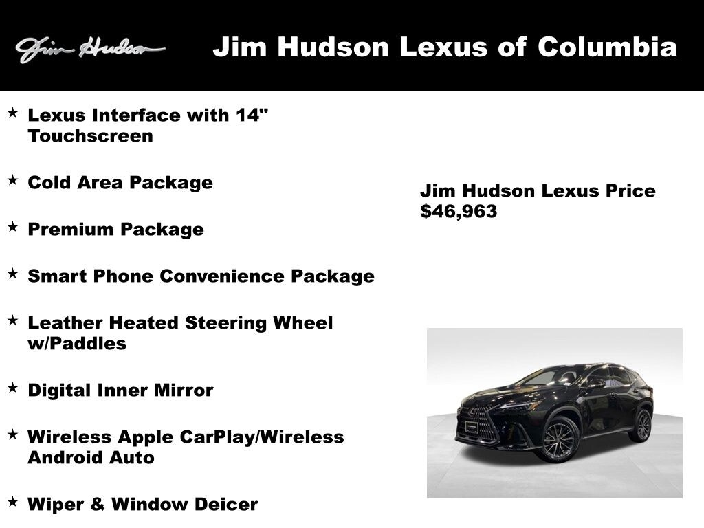 2024 Lexus NX 350 Premium Lexus Interface with 14" Touchscreen, Cold Area Package, Digital Inner Mirror, Leather Heated Steering Wheel w/Paddles, Premium Package, Smart Phone Convenience Package, Wiper & Window Deicer, Wireless Apple CarPlay/Wireless Android Auto.