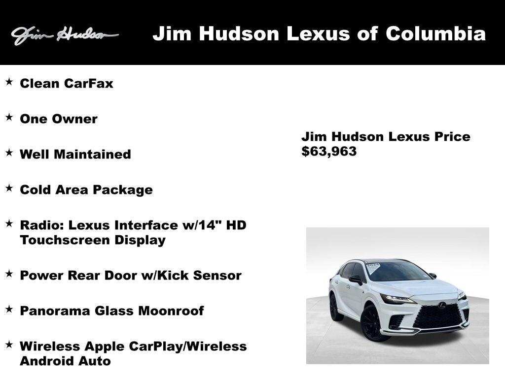 2024 Lexus RX 500h F SPORT Performance Clean CarFax, One Owner, Well Maintained, 2.4L I4 PDI Hybrid Turbocharged DOHC 16V LEV3-SULEV30 274hp, AWD, Black w/Dark Graphite Aluminum w/Leather/Ultra Suede Seat Trim, 21" Alloy Wheels, Cold Area Package, Panorama Glass Moonroof, Power Rear Door w/Kick Sensor, Radio: Lexus Interface w/14" HD Touchscreen Display, Wireless Apple CarPlay/Wireless Android Auto.