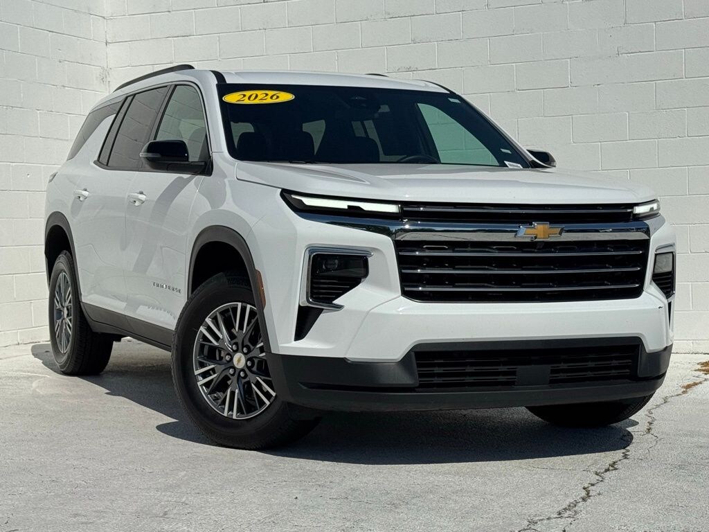 Jim Hudson Chevrolet is proud to present you with another True Market Priced Pre-Owned Vehicle. This 2026 Chevrolet Traverse LT is loaded with the following Factory Options:Preferred Equipment Group 1LT, Automatic temperature control, Fully automatic headlights, Navigation System, Power Liftgate, 3rd row seats: split-bench, 4-Way Manual Front Passenger Seat Adjuster, 4-Wheel Disc Brakes, 6 Speakers, 6-Speaker Audio System Feature, 8-Way Power Driver Seat Adjuster, ABS brakes, Air Conditioning, Alloy wheels, AM/FM radio: SiriusXM with 360L, Apple CarPlay/Android Auto, Auto High-beam Headlights, Brake assist, Bumpers: body-color, Child-Seat-Sensing Airbag, Compass, Delay-off headlights, Driver door bin, Driver vanity mirror, Dual front impact airbags, Dual front side impact airbags, Electronic Stability Control, Emergency communication system: OnStar, Four wheel independent suspension, Front anti-roll bar, Front Bucket Seats, Front Center Armrest, Front dual zone A/C, Front reading lights, Heated door mirrors, Heated Driver and Front Passenger Seats, Heated front seats, Heated steering wheel, Illuminated entry, Low tire pressure warning, Occupant sensing airbag, Outside temperature display, Overhead airbag, Overhead console, Panic alarm, Passenger door bin, Passenger vanity mirror, Power door mirrors, Power driver seat, Power steering, Power windows, Premium Cloth Seat Trim, Radio data system, Radio: : Audio System w/17.7" Diagonal Display, Rear air conditioning, Rear anti-roll bar, Rear reading lights, Rear window defroster, Rear window wiper, Remote keyless entry, Security system, SiriusXM with 360L Trial Subscription, Speed control, Speed-sensing steering, Spoiler, Steering wheel mounted audio controls, Tachometer, Telescoping steering wheel, Tilt steering wheel, Traction control, Trip computer, Turn signal indicator mirrors, Variably intermittent wipers, Voltmeter, and Wheels: 18" Grazen Metallic Machined-Face Aluminum Visit www.FuelEconomy.gov to get current fuel economy ratings for this vehicle.
