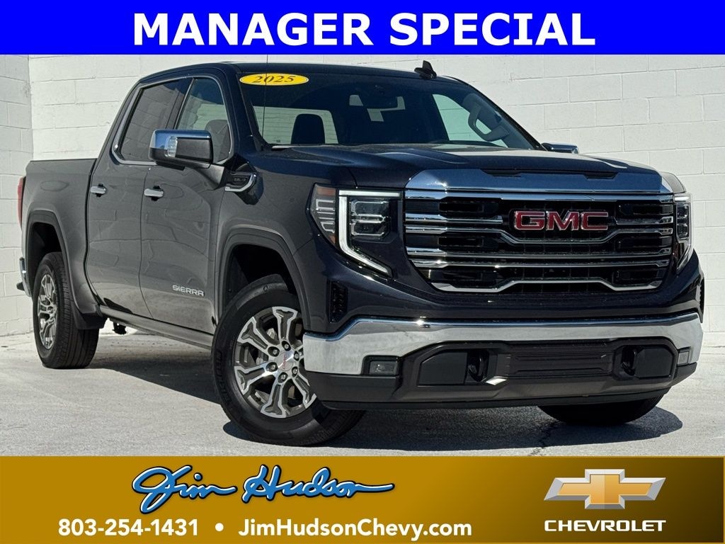 Jim Hudson Chevrolet is proud to present you with another True Market Priced Pre-Owned Vehicle. This 2025 GMC Sierra 1500 SLT is loaded with the following Factory Options:Standard Suspension Package, Trailering Package (Hitch Guidance), 10-Speed Automatic, Jet Black w/Leather-Appointed Seat Trim, 10-Way Power Driver Seat Adjuster w/Lumbar, 10-Way Power Passenger Seat Adjuster w/Lumbar, 120-Volt Bed Mounted Power Outlet, 120-Volt Interior Power Outlet, 170 Amp Alternator, 2 Charge/Data USB Ports, 2 Type-C Charge-Only Rear USB Ports, 3.23 Rear Axle Ratio, 4-Wheel Disc Brakes, 6 Speakers, 6-Speaker Audio System Feature, ABS brakes, Air Conditioning, Alloy wheels, AM/FM radio: SiriusXM with 360L, Apple CarPlay/Android Auto, Auto High-beam Headlights, Auto-dimming door mirrors, Auto-dimming Rear-View mirror, Auto-Locking Rear Differential, Automatic Emergency Braking, Automatic temperature control, Auxiliary External Transmission Oil Cooler, Brake assist, Buckle to Drive, Bumpers: chrome, Chrome Header & Chrome Grille Insert Bars, Color-Keyed Carpeting Floor Covering, Compass, Deep-Tinted Glass, Delay-off headlights, Driver door bin, Driver Memory, Driver vanity mirror, Dual front impact airbags, Dual front side impact airbags, Electric Rear-Window Defogger, Electronic Stability Control, Emergency communication system: OnStar, Following Distance Indicator, Forward Collision Alert, Front 40/20/40 Split-Bench Seat, Front anti-roll bar, Front Center Armrest w/Storage, Front dual zone A/C, Front fog lights, Front Frame-Mounted Black Recovery Hooks, Front Pedestrian Braking, Front Rain-Sensing Wipers, Front reading lights, Front wheel independent suspension, Fully automatic headlights, HD Rear Vision Camera, Heated door mirrors, Heated Driver & Front Outboard Passenger Seating, Heated front seats, Heated steering wheel, Illuminated entry, Integrated Trailer Brake Controller, IntelliBeam Automatic High Beam On/Off, Keyless Open & Start, Lane Keep Assist w/Lane Departure Warning, LED Cargo Area Lighting, Low tire pressure warning, Manual Tilt-Wheel & Telescoping Steering Column, Memory seat, Navigation System, Occupant sensing airbag, OnStar Services Capable, Outside temperature display, Overhead airbag, Overhead console, Panic alarm, Passenger door bin, Passenger vanity mirror, Perf Leather-Appointed Front Outboard Seat Trim, Perimeter Lighting, Power Door Locks, Power door mirrors, Power driver seat, Power Front Passenger Windows w/Express Up/Down, Power Front Windows w/Driver Express Up/Down, Power passenger seat, Power Rear Windows w/Express Down, Power steering, Power windows, Push Button Start, Radio data system, Radio: Premium GMC Infotainment Audio System, Rain sensing wipers, Rear reading lights, Rear seat center armrest, Rear step bumper, Rear Wheelhouse Liners, Rear window defroster, Remote keyless entry, Remote Vehicle Starter System, Security system, SiriusXM w/360L Trial Subscription, Speed control, Speed-sensing steering, Split folding rear seat, Steering Wheel Audio Controls, Steering wheel mounted audio controls, Tachometer, Telescoping steering wheel, Theft Deterrent System (Unauthorized Entry), Tilt steering wheel, Traction control, Trip computer, Variably intermittent wipers, Voltmeter, Wheels: 18" x 8.5" 6-Spoke Machined Aluminum, Wi-Fi Hotspot Capable, and Wireless Apple CarPlay/Wireless Android Auto Visit www.FuelEconomy.gov to get current fuel economy ratings for this vehicle.