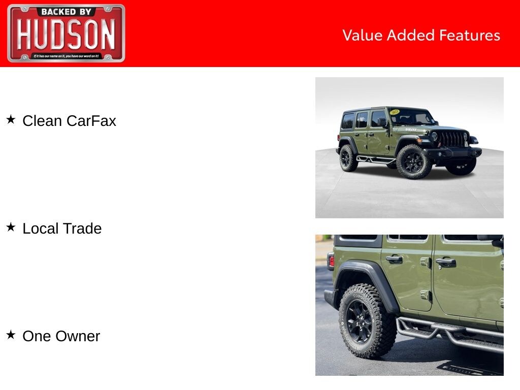 Clean CarFax, Local Trade, One Owner, 2-Door Passive Entry, Front Door Locks, 3.45 Overall Top Gear Ratio, 4-Wheel Disc Brakes, 4-Wheel Drive Swing Gate Decal, 8 Speakers, ABS brakes, Air Conditioning, Air Conditioning w/Auto Temperature Control, Air Filtering, AM/FM radio, Anti-Spin Differential Rear Axle, Apple CarPlay, Apple CarPlay/Android Auto, Automatic Headlamps, Aux Battery, Black 3-Piece Hard Top, Black Grille, Brake assist, Cloth Low-Back Bucket Seats, Cluster 7.0" TFT Color Display, Compass, Deep Tint Sunscreen Windows, Delay-off headlights, Driver door bin, Driver vanity mirror, Dual front impact airbags, Dual front side impact airbags, Electronic Stability Control, Emergency communication system: SiriusXM Guardian, Engine Oil Cooler, Freedom Panel Storage Bag, Front 1-Touch Down Power Windows, Front anti-roll bar, Front Bucket Seats, Front Center Armrest w/Storage, Front fog lights, Front LED Fog Lamps, Front reading lights, Google Android Auto, GPS Antenna Input, Integrated Center Stack Radio, Integrated roll-over protection, Integrated Voice Command w/Bluetooth, LED Headlamp & Fog Lamp Group, LED Premium Reflector Headlamps, Low tire pressure warning, Mold In Color Bumper w/Gloss Black, MOPAR All-Weather Floor Mats, No Soft Top, Non-Lock Fuel Cap w/o Discriminator, Normal Duty Suspension, Occupant sensing airbag, Outside temperature display, ParkView Rear Back-Up Camera, Passenger door bin, Passenger vanity mirror, Power Heated Mirrors, Power steering, Premium Wrapped Steering Wheel, Quick Order Package 22W Willys, Quick Order Package 23W Willys, Radio data system, Radio: Uconnect 4 w/7" Display, Rear anti-roll bar, Rear reading lights, Rear Window Defroster, Rear Window Wiper/Washer, Remote Keyless Entry, Security Alarm, SiriusXM Satellite Radio, Speed control, Speed Sensitive Power Locks, Split folding rear seat, Steering wheel mounted audio controls, Stop-Start Dual Battery System, Sun Visors w/Illuminated Vanity Mirrors, Tachometer, Technology Group, Telescoping steering wheel, Tilt steering wheel, Traction control, Trip computer, USB Host Flip, Variably intermittent wipers, Wheels: 17" x 7.5" Black Aluminum, Wheels: 17" x 7.5" Black Steel Styled, Wheels: 17" x 7.5" Moab Black Aluminum (DISC), Willys, Willys Hood Decal.