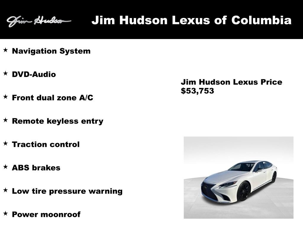 2020 Lexus LS 500 Black w/Quilted-Stitch Semi-Aniline Leather Seat Trim (LC), ABS brakes, Active Cruise Control, Alloy wheels, Compass, DVD-Audio, Electronic Stability Control, Front Bucket Seats, Front Center Armrest, Front dual zone A/C, Heated & Ventilated Front Bucket Seats, Heated door mirrors, Heated front seats, Illuminated entry, Leather Seat Trim, Low tire pressure warning, Navigation System, Power moonroof, Power passenger seat, Remote keyless entry, Traction control, Ventilated front seats.