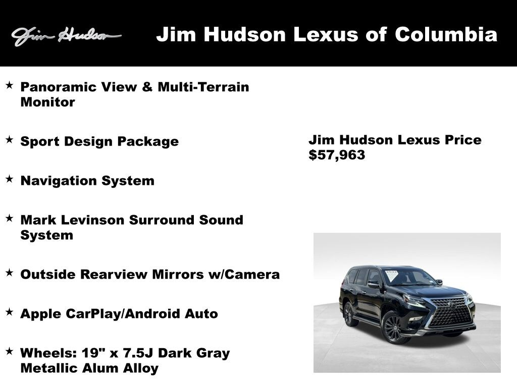 2022 Lexus GX 460 Luxury Apple CarPlay/Android Auto, Mark Levinson Surround Sound System, Navigation System, Outside Rearview Mirrors w/Camera, Panoramic View & Multi-Terrain Monitor, Sport Design Package, Wheels: 19" x 7.5J Dark Gray Metallic Alum Alloy.