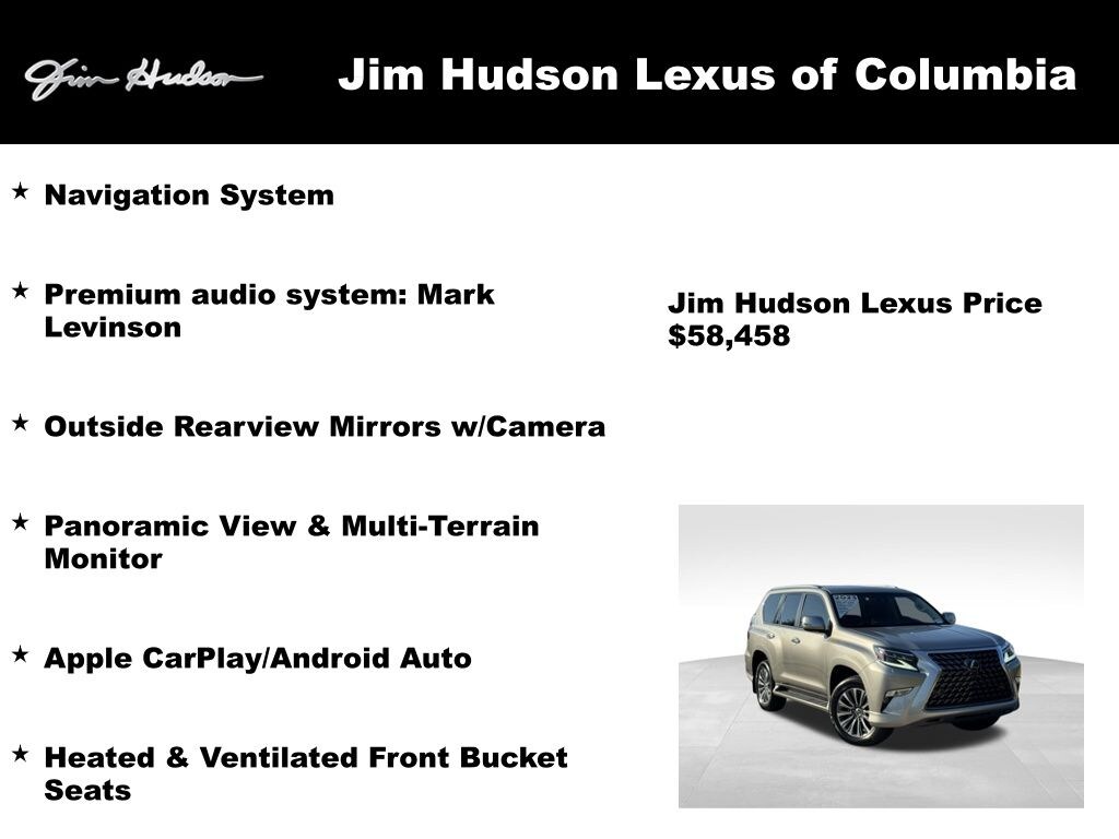 2023 Lexus GX 460 Luxury Apple CarPlay/Android Auto, Heated & Ventilated Front Bucket Seats, Navigation System, Outside Rearview Mirrors w/Camera, Panoramic View & Multi-Terrain Monitor, Premium audio system: Mark Levinson.
