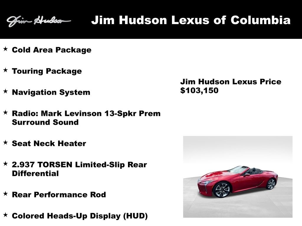 2023 Lexus LC 500 2.937 TORSEN Limited-Slip Rear Differential, Apple CarPlay/Android Auto, Carbon-Fiber Door Scuff Plates, Cold Area Package, Colored Heads-Up Display (HUD), Heated Leather Steering Wheel, Navigation System, Radio: Mark Levinson 13-Spkr Prem Surround Sound, Rear Performance Rod, Seat Neck Heater, Semi-Aniline Perforated Leather Seat Surfaces, Touring Package, Wheels: 21" Forged Alloy.
