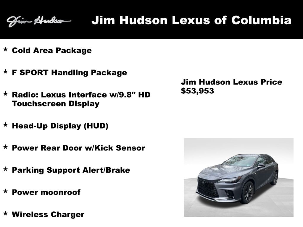 2023 Lexus RX 350 F Sport Handling AWD, Black w/Dark Graphite Aluminum w/F SPORT NuLuxe Seat Trim, 8-Way Power Driver & Front Passenger Seat Adjusters, Cold Area Package, F SPORT Handling Package, Head-Up Display (HUD), Heated & Ventilated Front Bucket Seats, Multi-Color Illuminated Entry System, Parking Support Alert/Brake, Power moonroof, Power Rear Door w/Kick Sensor, Radio: Lexus Interface w/9.8" HD Touchscreen Display, Wireless Apple CarPlay/Wireless Android Auto, Wireless Charger.