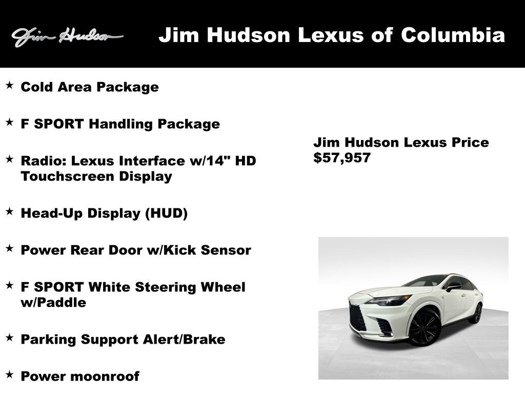 2023 Lexus RX 350 F Sport Handling AWD, Rioja Red w/Dark Graphite Aluminum w/F SPORT NuLuxe Seat Trim, Advanced Park, Cold Area Package, Digital Rearview Mirror, F SPORT Handling Package, F SPORT White Steering Wheel w/Paddle, Head-Up Display (HUD), Heated & Ventilated Front Bucket Seats, Multi-Color Illuminated Entry System, Panoramic View Monitor w/BSM, Parking Support Alert/Brake, Power moonroof, Power Rear Door w/Kick Sensor, Radio: Lexus Interface w/14" HD Touchscreen Display, Wireless Apple CarPlay/Wireless Android Auto, Wireless Charger.