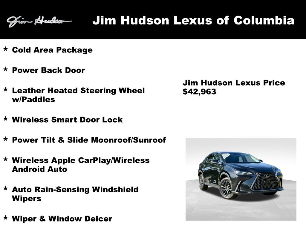 2024 Lexus NX 350 Auto Rain-Sensing Windshield Wipers, Cold Area Package, Leather Heated Steering Wheel w/Paddles, Power Back Door, Power Tilt & Slide Moonroof/Sunroof, Wiper & Window Deicer, Wireless Apple CarPlay/Wireless Android Auto, Wireless Smart Door Lock.