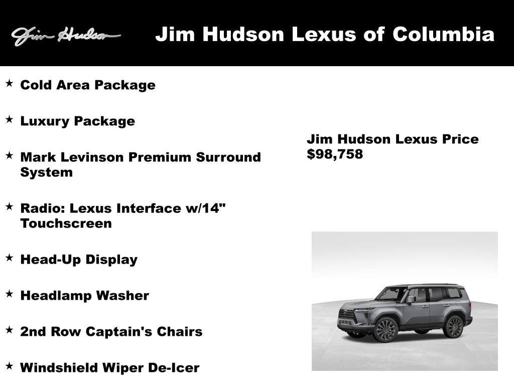 2025 Lexus GX 550 Luxury 2nd Row Captain's Chairs, Cold Area Package, Head-Up Display, Headlamp Washer, Luxury Package, Mark Levinson Premium Surround System, Radio: Lexus Interface w/14" Touchscreen, Windshield Wiper De-Icer.