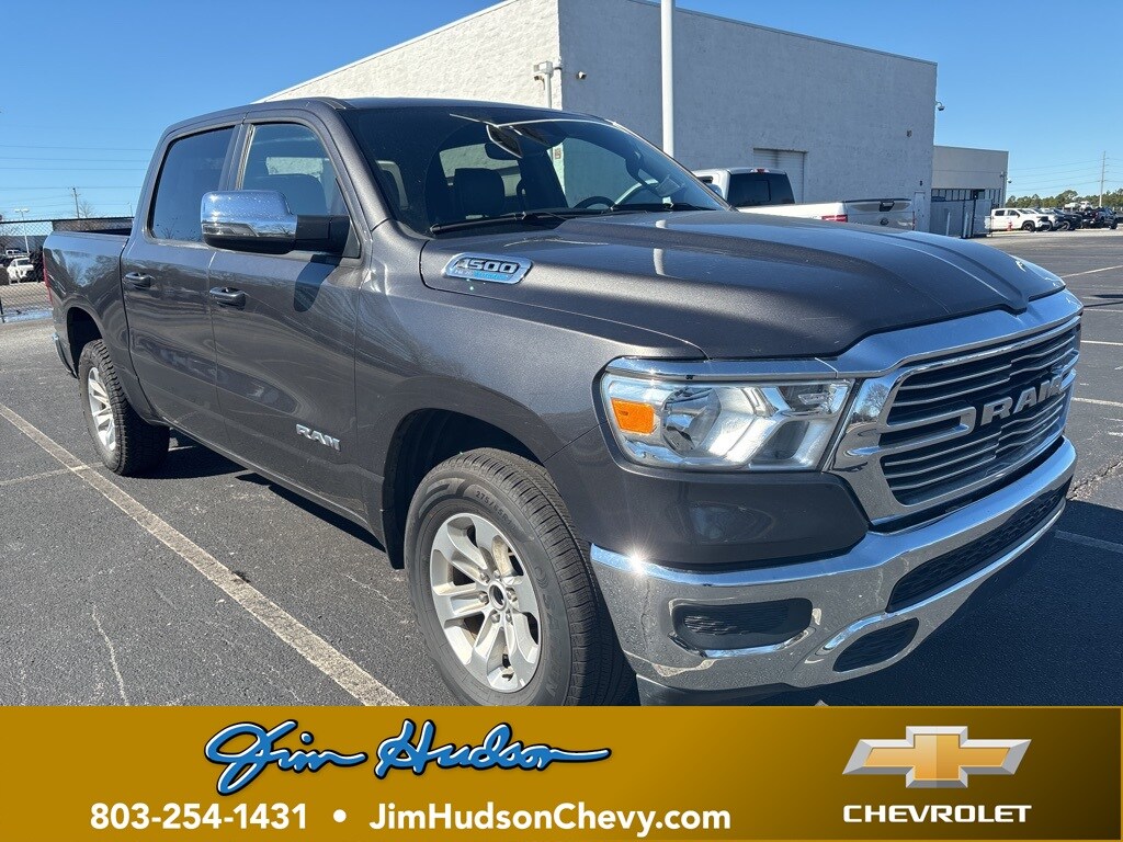 Jim Hudson Chevrolet is proud to present you with another True Market Priced Pre-Owned Vehicle. This 2024 Ram 1500 Laramie is loaded with the following Factory Options:Quick Order Package 27H Laramie, Apple CarPlay/Android Auto, GPS Navigation, Heated Front Seats, Leather Trim 40/20/40 Bench Seat, Memory seat, Navigation System, 10 Speakers, 3 Rear Seat Head Restraints, 3.21 Rear Axle Ratio, 4 Way Front Headrests, 4-Wheel Disc Brakes, 48V Belt Starter Generator, 4G LTE Wi-Fi Hot Spot, ABS brakes, Air Conditioning, Alloy wheels, AM/FM radio: SiriusXM with 360L, Apple CarPlay, Audio memory, Auto-dimming door mirrors, Auto-Dimming Exterior Driver Mirror, Auto-dimming Rear-View mirror, Automatic temperature control, Brake assist, Bucket Seats, Bumpers: chrome, Chrome Exterior Mirrors, Compass, Connected Travel & Traffic Services, Connectivity - US/Canada, Convex Wide-Angle Exterior Mirror Insert, Delay-off headlights, Driver door bin, Driver Seat Memory, Driver vanity mirror, Dual front impact airbags, Dual front side impact airbags, Electronic Stability Control, Exterior Mirrors Courtesy Lamps, Exterior Mirrors w/Heating Element, Exterior Mirrors w/Memory, Exterior Mirrors w/Supplemental Signals, Exterior Parking Camera Rear, For Details, Visit DriveUconnect.com, For More Info, Call 800-643-2112, Front anti-roll bar, Front Center Armrest w/Storage, Front dual zone A/C, Front fog lights, Front reading lights, Front Seat Back Map Pockets, Front wheel independent suspension, Full Length Upgraded Floor Console, Fully automatic headlights, Garage door transmitter, Global Telematics Box Module (TBM), Google Android Auto, HD Radio, Heated door mirrors, Heated Steering Wheel, Heated steering wheel, Illuminated entry, Integrated Voice Command w/Bluetooth, Leather steering wheel, Leather Trimmed Bucket Seats, Low tire pressure warning, Occupant sensing airbag, Outside temperature display, Overhead airbag, Overhead console, Panic alarm, Passenger door bin, Passenger vanity mirror, Power 2-Way Driver Lumbar Adjust, Power 2-Way Passenger Lumbar Adjust, Power 8-Way Driver & Passenger Seats, Power door mirrors, Power driver seat, Power passenger seat, Power steering, Power windows, Power-Folding Mirrors, Radio data system, Radio: Uconnect 5 Nav w/8.4" Display, RAM Grille Badge - Chrome, Rear 60/40 Folding Seat, Rear anti-roll bar, Rear seat center armrest, Rear step bumper, Remote keyless entry, Security system, SiriusXM Radio Service, SiriusXM w/360L, Speed control, Split folding rear seat, Steering wheel mounted audio controls, Tachometer, Telescoping steering wheel, Tilt steering wheel, Traction control, Trip computer, Turn signal indicator mirrors, Variably intermittent wipers, Ventilated Front Seats, Ventilated front seats, Voltmeter, and Wheels: 18" x 8" Aluminum Base Painted Visit www.FuelEconomy.gov to get current fuel economy ratings for this vehicle.